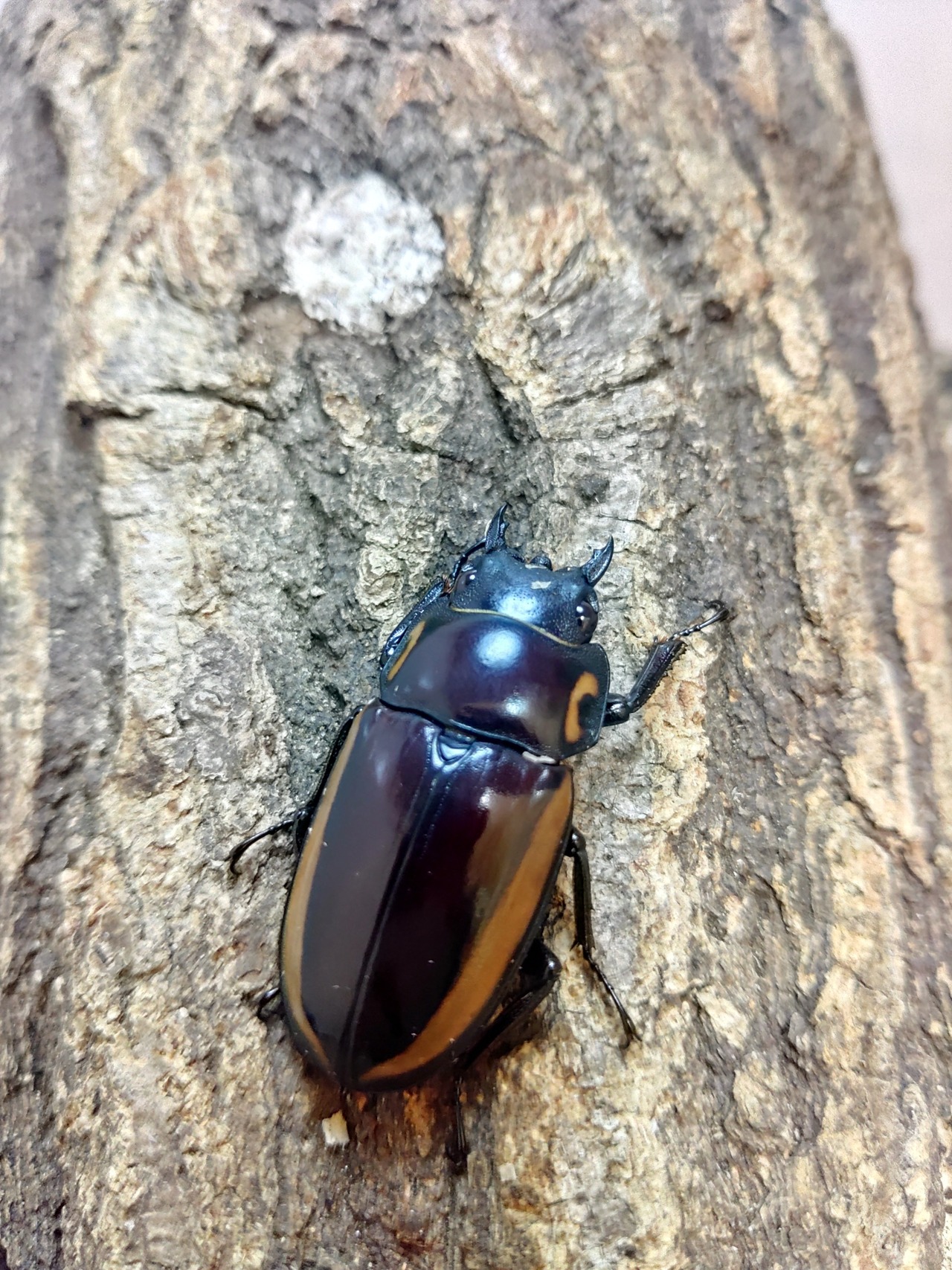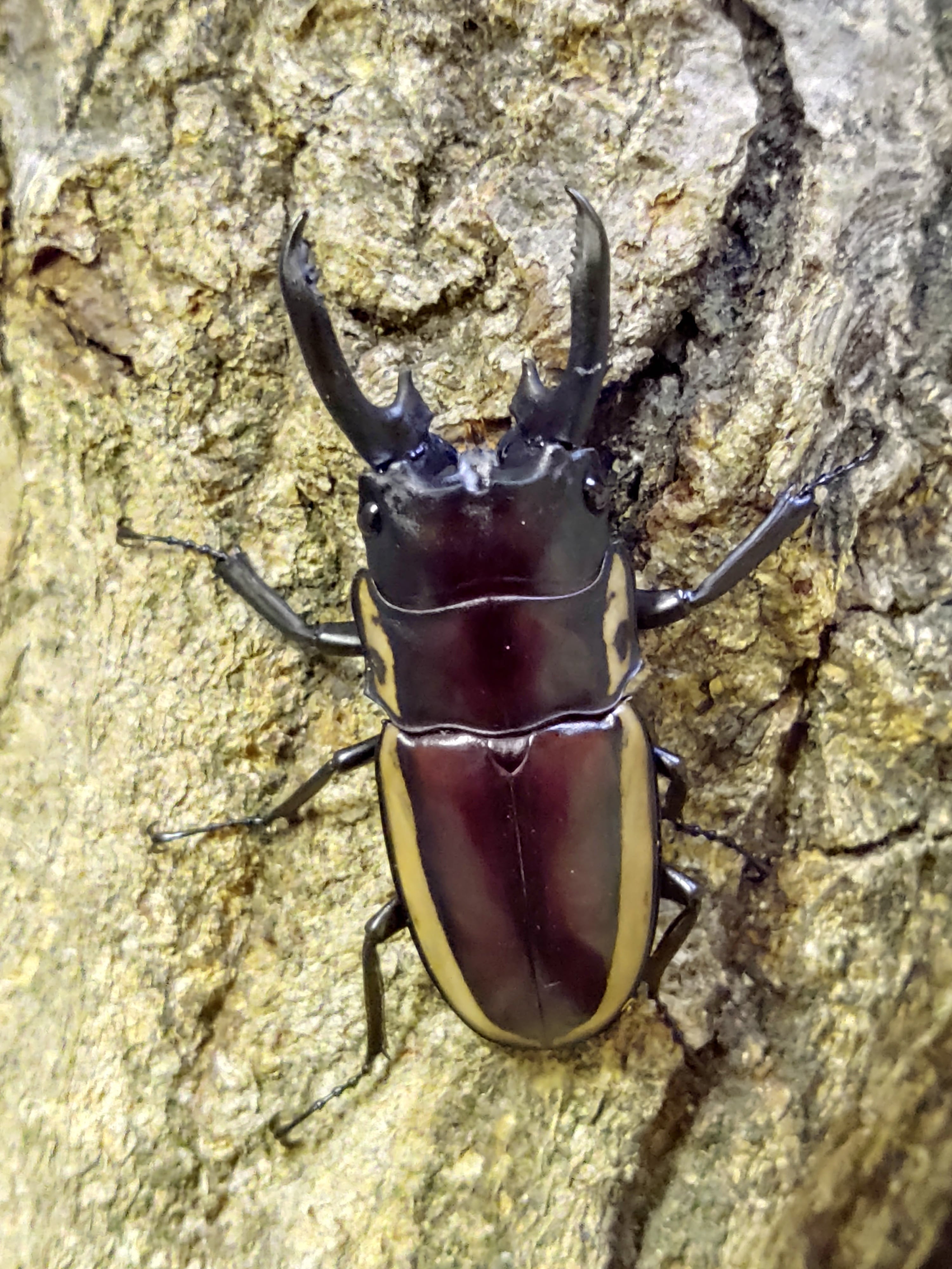 オス・メス共通の特徴として、体の縁に胸部から尻にかけて、黄色のラインがあり、前胸背面左右のラインの上には、黒い斑点が特徴です。