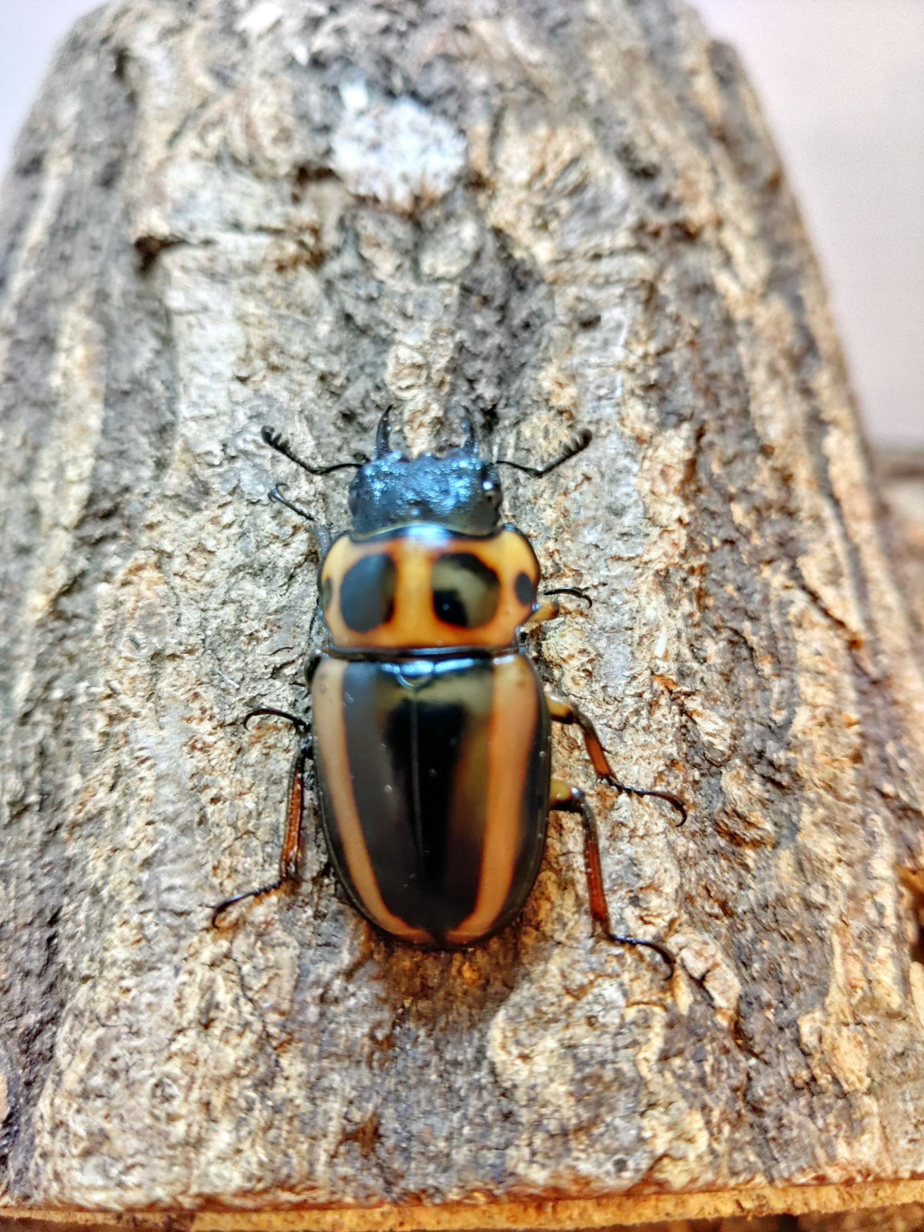 黄褐色の体色に、独特な体型。そして、複数の黒斑が特徴的なアフリカのクワガタムシです。